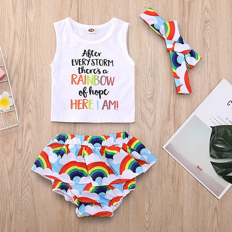 Special Price for Boutique Kids Clothing 3 Pcs Girl Set Here I Am Letters Sleeveless White Top Rainbow Ruffle Shorts